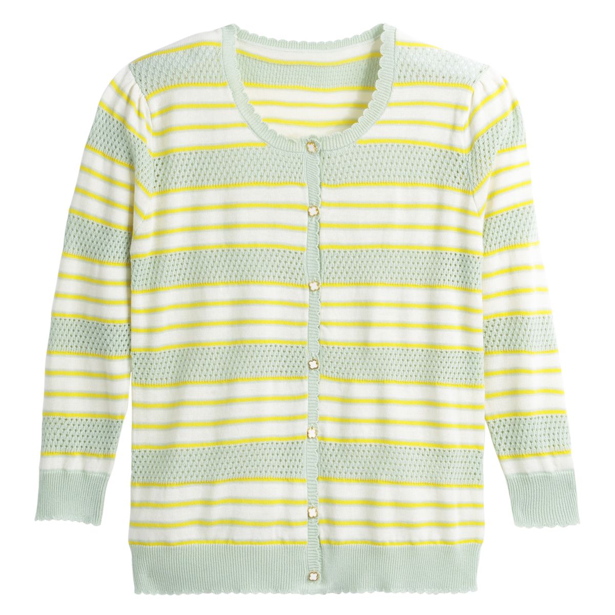 Cet été, la tendance pastel s’affirme. On adopte sans hésiter cet adorable cardigan animé de maille pointelle et de rayures.Détails produit Cardigan col rond Manches longues Col rond Motif a rayures Fermeture boutonnéeComposition et Entretien 55% acrylique, 45% coton Température de lavage 30° cycle délicat Température de repassage faible / blanchiment interdit Ne pas sécher en tambour Pas de nettoyage à secEn savoir plus Longueur : 59 cm en taille M